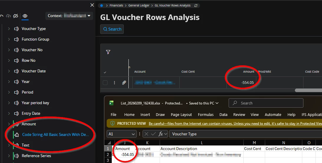 We observed, in Cloud 24R2, that in GL Voucher Rows Analysis, the code part fields are all clustered together and it would not be possible to insert a different column between them and have the columns exported to Excel that way. We can, for example, use Column Chooser to put Amount after Cost Center, but when exporting the results to Excel, this column ordering is not enforced, instead all code string columns are in order together. Furthermore, we could not place fields in between the code string fields within page designer, as code string is it’s own group.