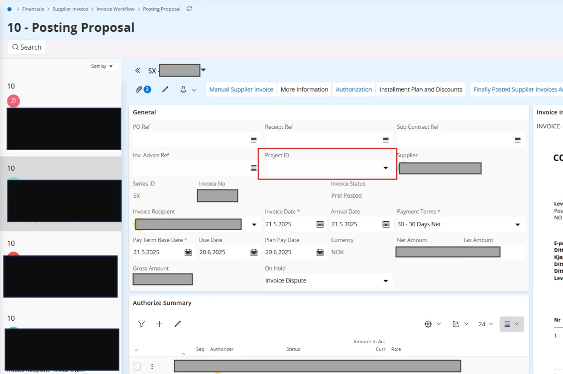 In IFS Cloud, we receive most supplier invoices electronically and they are processed automatically and created as preliminary invoices (I-voucher). Since suppliers only provide PO numbers, these are without a Project ID. We then manually enter the project ID on the invoice by adding the Project ID in the Posting Proposal Head or on the Posting Lines.