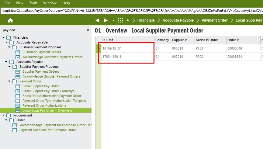 I have created a Custom Field in the 'Supplier Payment Order' screen that concatenates multiple Purchase Order numbers into a semicolon-separated string (e.g., '00001;00002;00003') using LISTAGG.
