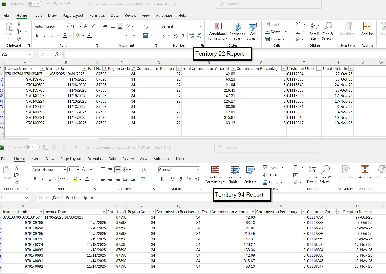 The screen shot below shows the same 10 lines of invoice number / customer order number on both commission report for Territory 22 and Territory 34. Based on the information in the customer order, the commission should only be reflected in Territory 22.