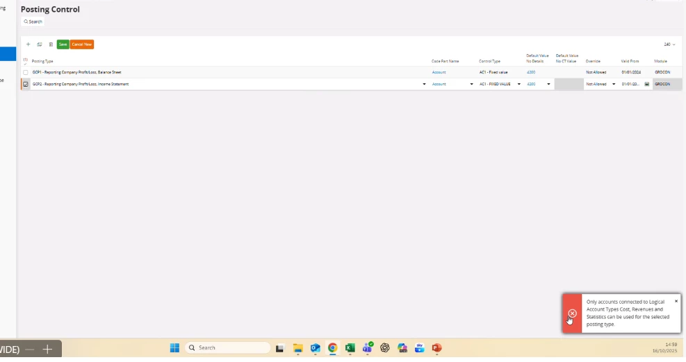 Encounter the following error when adding posting control GCP2 in 25.1.4 cloud version and I was able to add it without any issue in 25.1.3 to this account (4200) which is a liability account .