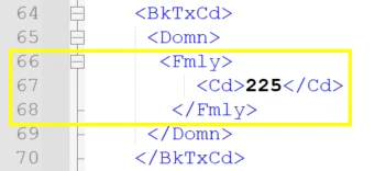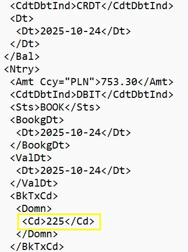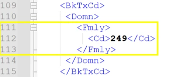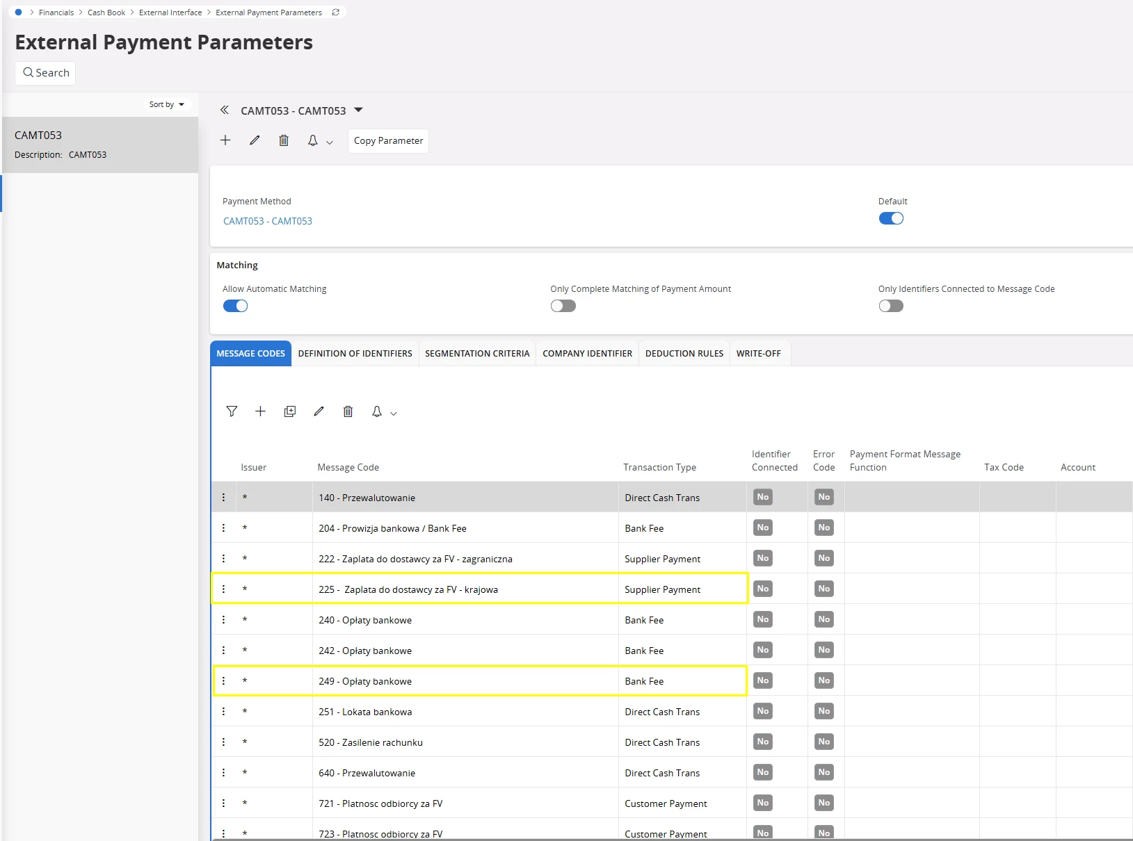 In this example, in the xml file I have message code “225” Supplier Payment and “249” Bank Fees.
