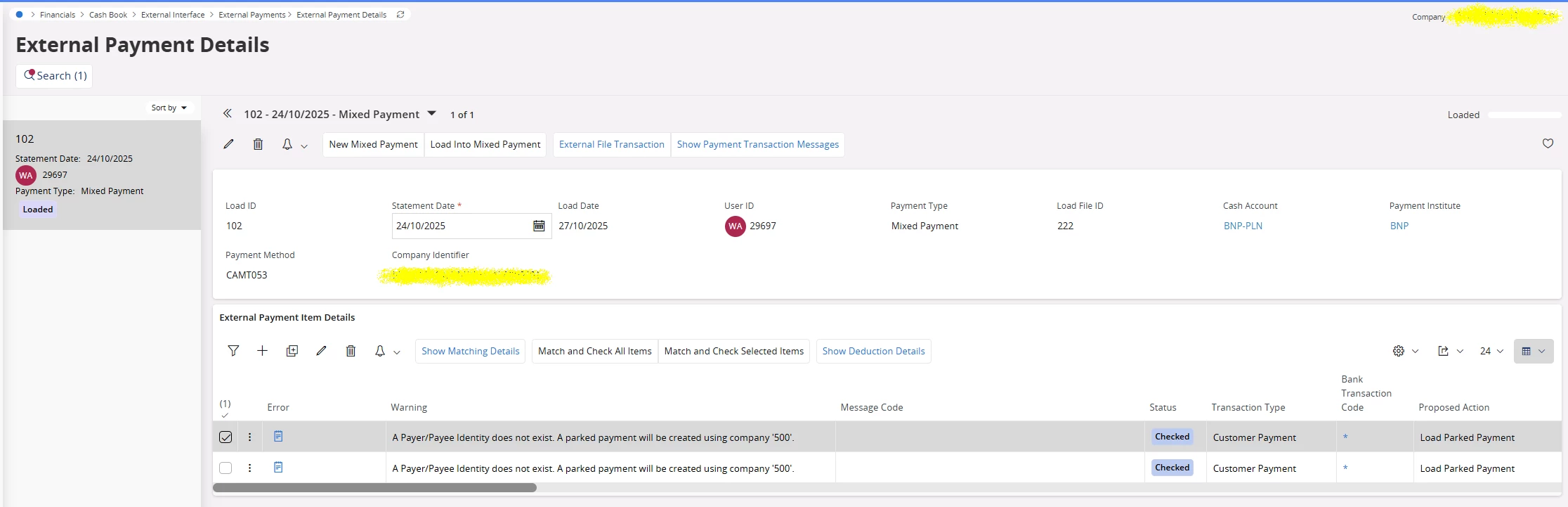 “A Payer/Payee Identity does not exist. A parked payment will be created using company '500'”