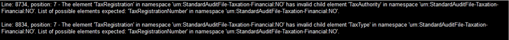 Line: 8734, position: 7 - The element 'TaxRegistration' in namespace 'urn:StandardAuditFile-Taxation-Financial:NO' has invalid child element 'TaxAuthority' in namespace 'urn:StandardAuditFile-Taxation-Financial:NO'. List of possible elements expected: 'TaxRegistrationNumber' in namespace 'urn:StandardAuditFile-Taxation-Financial:NO'.