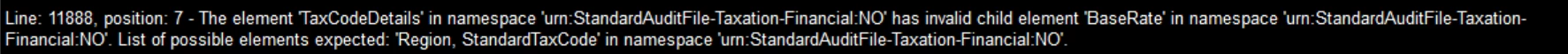 Line: 11888, position: 7 - The element 'TaxCodeDetails' in namespace 'urn:StandardAuditFile-Taxation-Financial:NO' has invalid child element 'BaseRate' in namespace 'urn:StandardAuditFile-Taxation-Financial:NO'. List of possible elements expected: 'Region, StandardTaxCode' in namespace 'urn:StandardAuditFile-Taxation-Financial:NO'.
