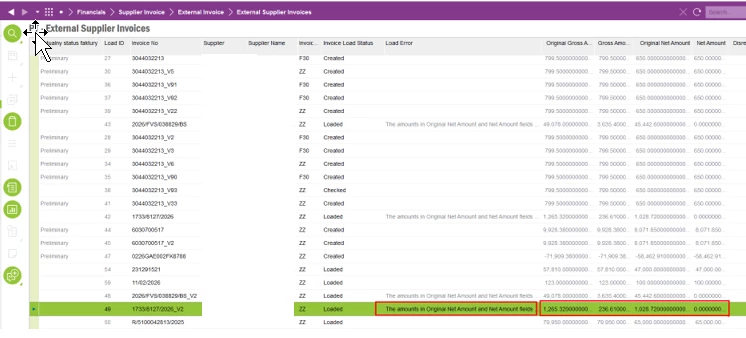 It's identified that user encountered an error when uploading external supplier invoices: "The amounts in Original Net Amount and Net Amount fields do not match for ZZ 1733/8127/2026 invoice. Select the Disregard Net Amount Differences check box if you want to continue. Otherwise, change the net amount for the invoice lines before you continue." And also, original gross amount, Gross amount, original net amount and the net amount also have different values in external supplier invoice window.