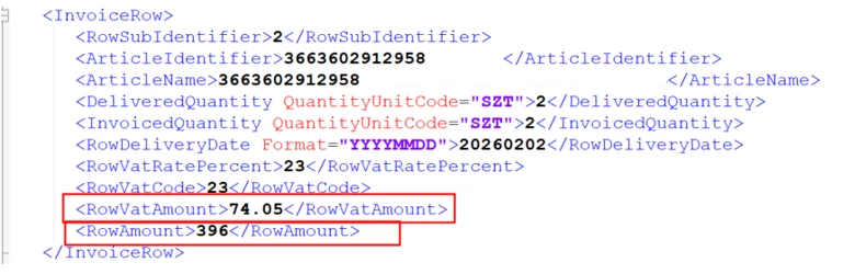 - The Gross Amount and Net Amount displayed in the invoice header are calculated based on the summation of tax-related tags within each <InvoiceRow> section.