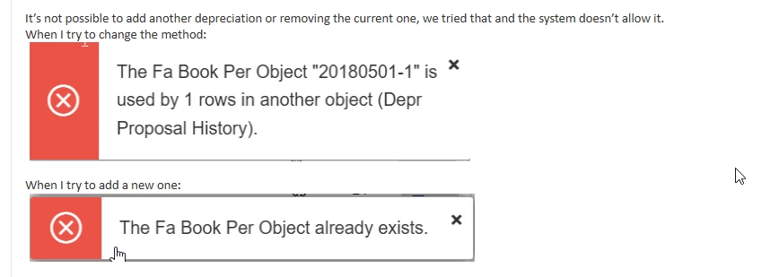 We found a solution to starting depreciation a specific date by creating a new depreciation method but we still have an issue for 2 of the 5 fixed assets objects. They where depreciated once in 2018 and therefor we can't change the depreciation method so we still need help with a solution for those two objects. Its not possible to add a new line or remove the existing line under the book tab