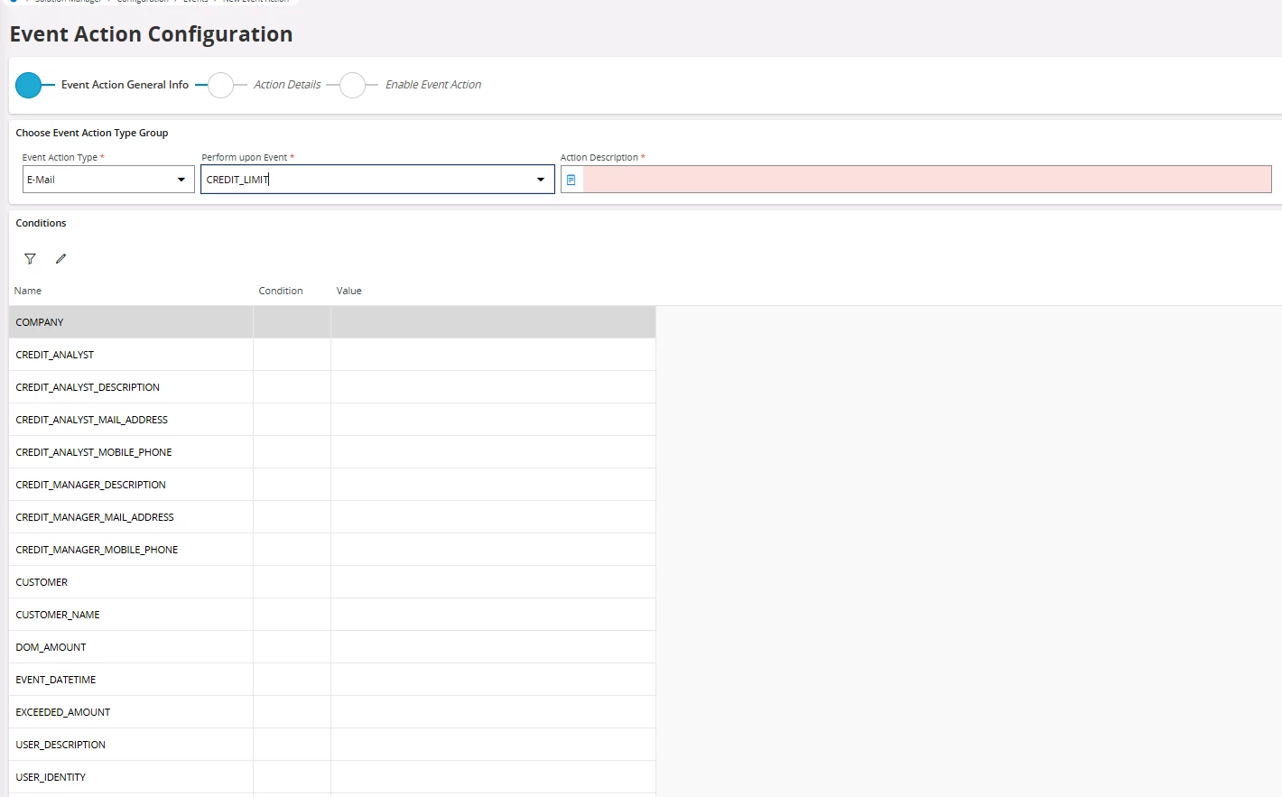 You may not need any conditions. Maybe company. The concept is to send an email. The email address to send to is probably
