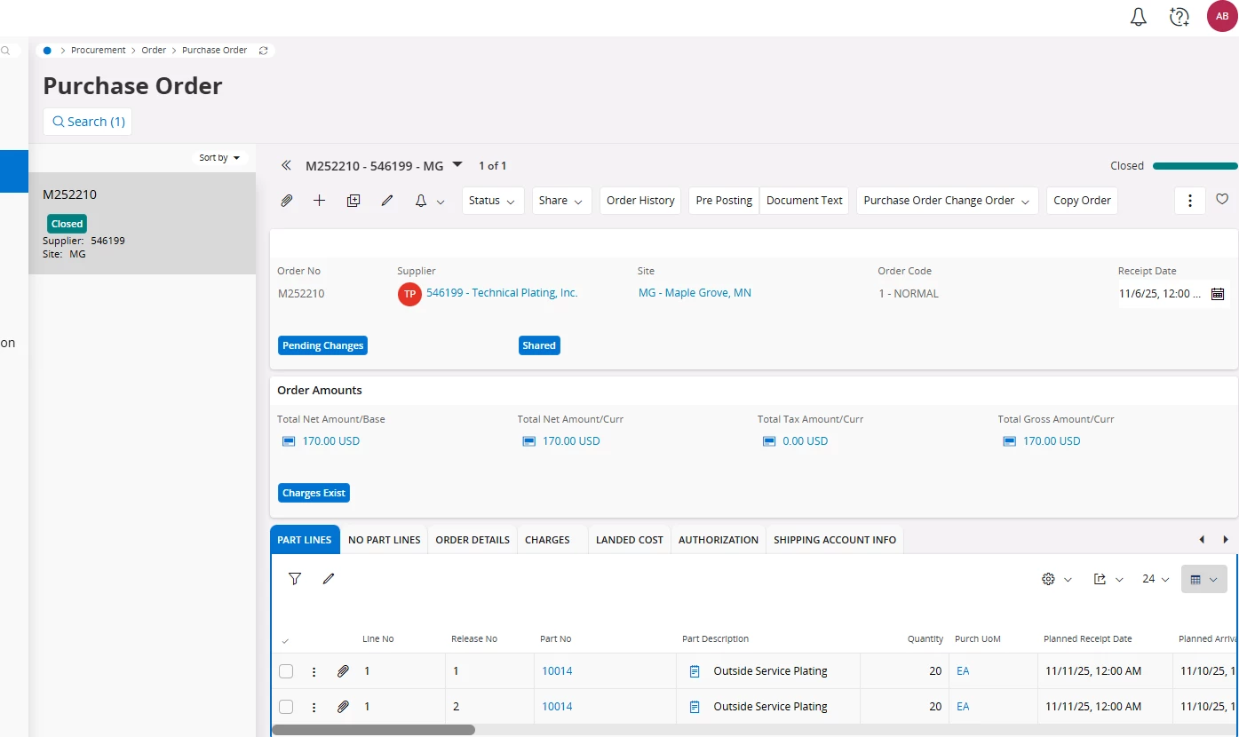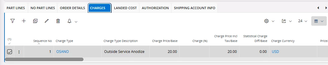 We have the following PO which we are trying to invoice, with 2 part lines and one charge line.