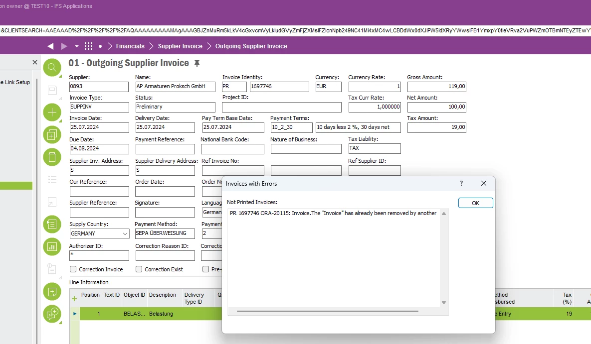 ORA-20115: Invoice.The "Invoice" has already been removed by another user.