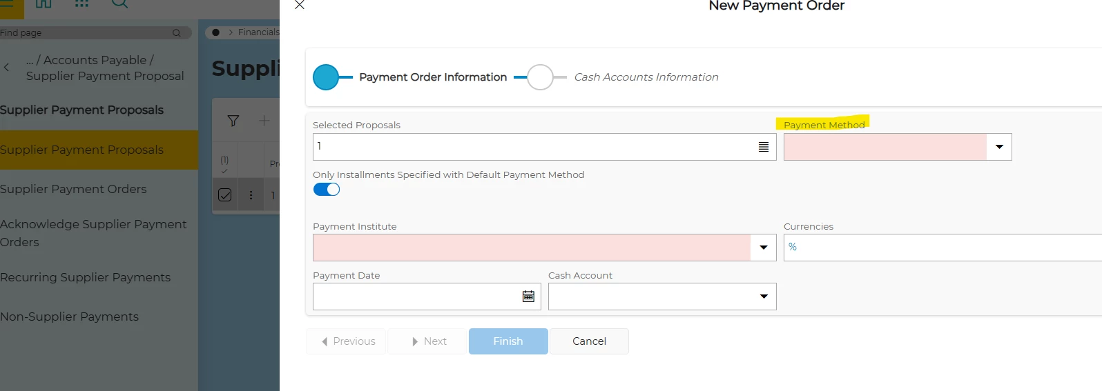 When we create a new supplier payment proposal and then create a new payment order, we select a payment method and a payment date.