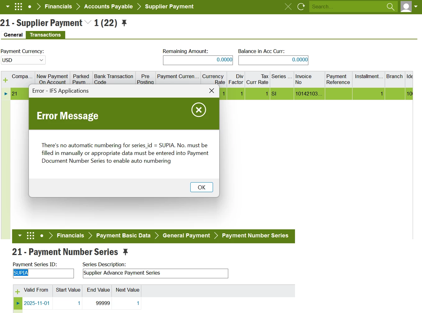 wondering how to resolve below issue? I am trying to approve below supplier payment, got this error - no SUPIA number series which is available in the system, please refer to below screenshots.