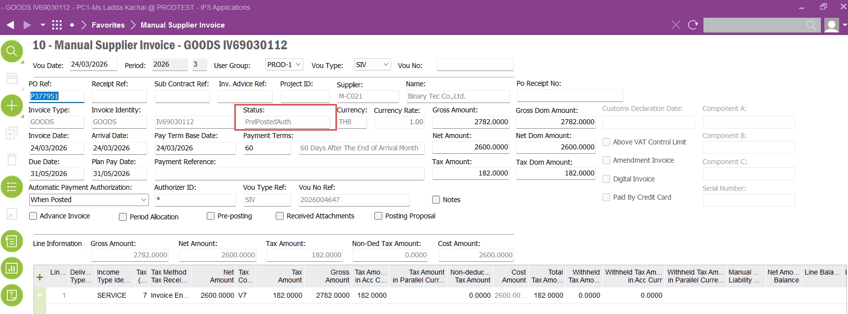 After manually entering supplier invoice and saving it, the system shows the status ‘PrelPostedAuth’. Could you please explain why this status occurs and what the cause is?
