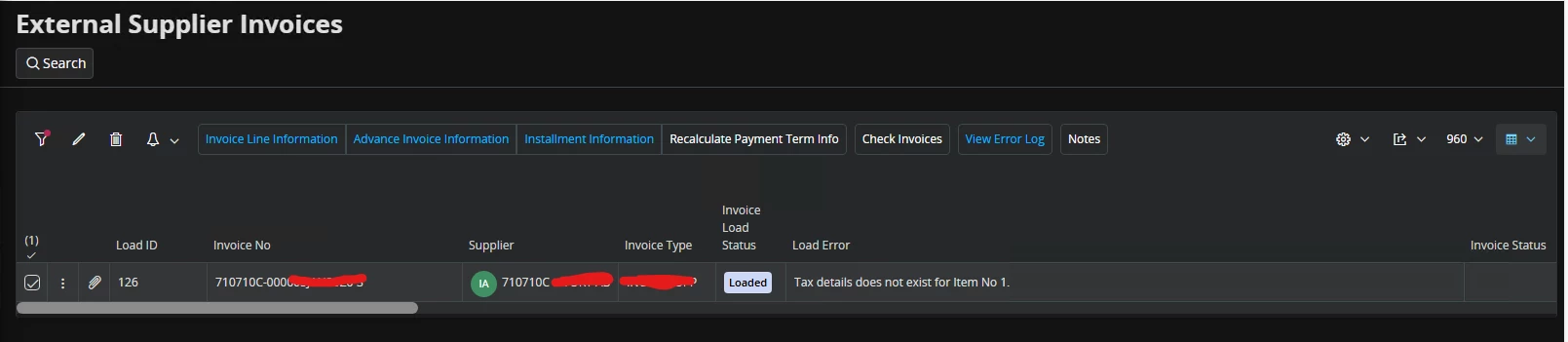 When loading supplier invoices into External Supplier Invoices window and if the Supplier ID does not exist in the system…. once the Supplier ID is corrected, the following error is received: