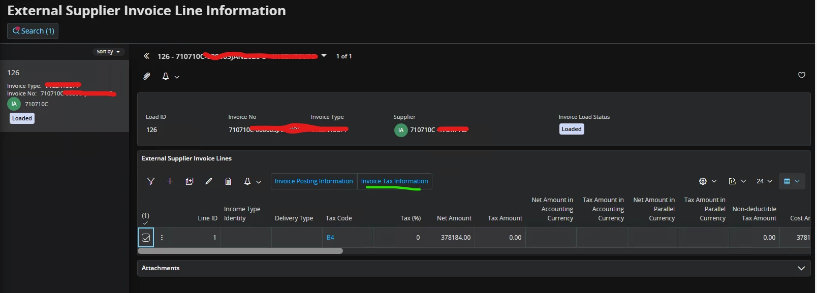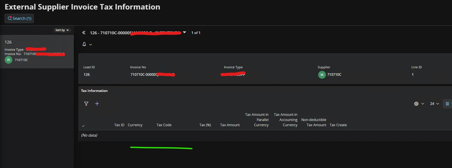 When clicked on ‘Invoice Tax Information’ on ‘External Supplier Invoice Line Information page, there is no record found: