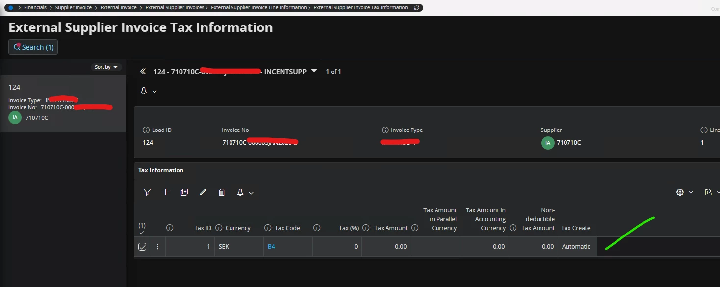 If I load another invoice with same dataset again with the correct ‘Supplier ID’ (Different Invoice number), there is no error and the invoice is getting created successfully with tax information being automatically created: