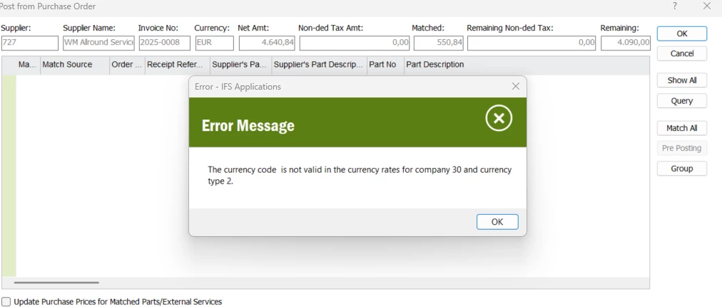 I don't understand what triggers the error message, because all the currencies we use are valid in the Currency Rates screen. Are you familiar with this message and do you have a solution for it?