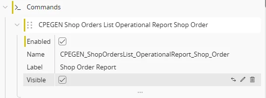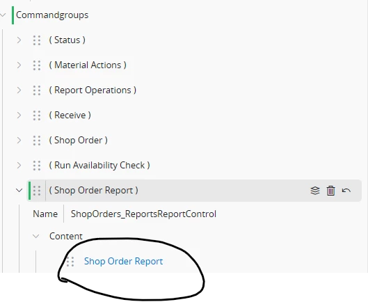I added the Command Group – ExecuteOperationalReport to the Shop Orders Material Availability page so that I could execute the Shop Order Report directly from this page, and it works as expected.