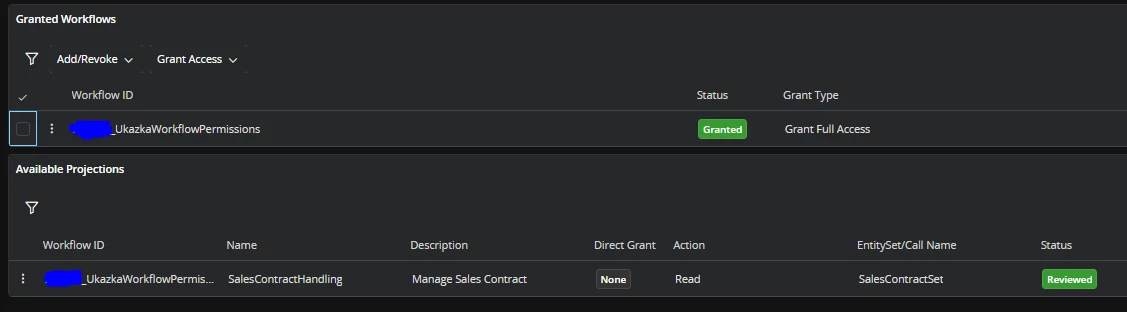 However I don’t seem to be able to make it work. I have a very simple test workflow run by clicking a button just reading from a projection not normally accessible to the basic user, I granted Internal access (also tried Full access out of frustration) for the workflow for the relevant permission set and I still get the FndProjectionGrant.SRV_NOT_ACCESS error.