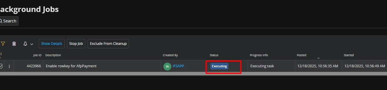 I am trying to activate the Rowkey for the AfpPayment entity; however, the background jobs remain in Executing status and do not complete.