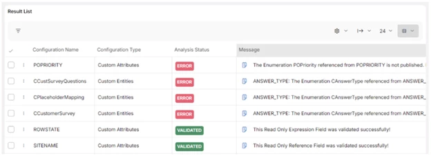 Configuration items with errors and warnings are displayed at the top, in the same sequence, followed by successfully validated ones to improve visibility. The full error or warning message can be viewed by selecting the message icon associated with each row.