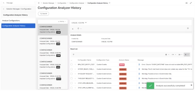 Once the analysis is completed, a toast message confirms completion. The user is automatically redirected to the Configuration Analyzer History page, displaying the results of the latest analysis.