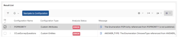 The Configuration Analyzer is a tool that analyzes and validates configurations in the target environment and identifies issues in configurations introduced by such deliveries. Typical issues are when a configuration references another object that is missing, renamed or in an invalid state after the update.