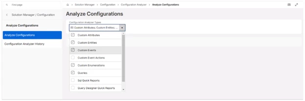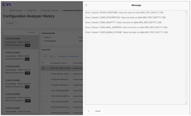Prior to IFS Cloud 25R1 SU10 & 25R2 SU2, Configuration Analyzer support was only available for Custom Attributes and Custom Entities. From IFS Cloud 25R1 SU10, 25R2 SU4 & 26R1 EA, analysis of all the following configuration types are supported in the tool.