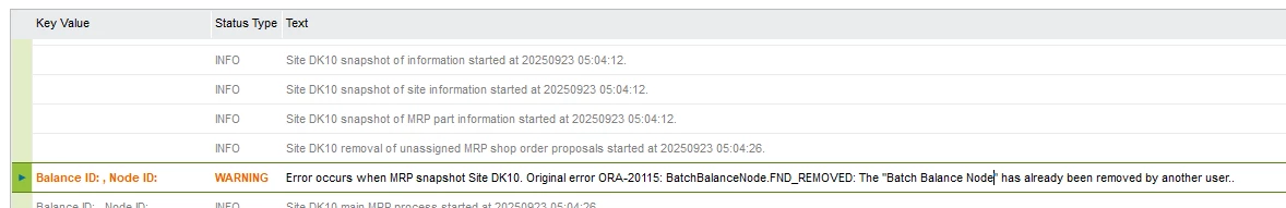 We are using IFS10 and time to time in backround job has warning : Error occurs when MRP snapshot Site DK10. Original error ORA-20115: BatchBalanceNode.FND_REMOVED: The "Batch Balance Node" has already been removed by another user..