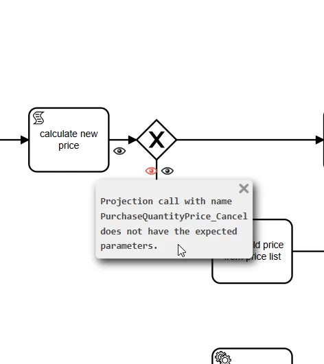 | Projection call with name PurchaseQuantityPrice_Cancel does not have the expected parameters. |
