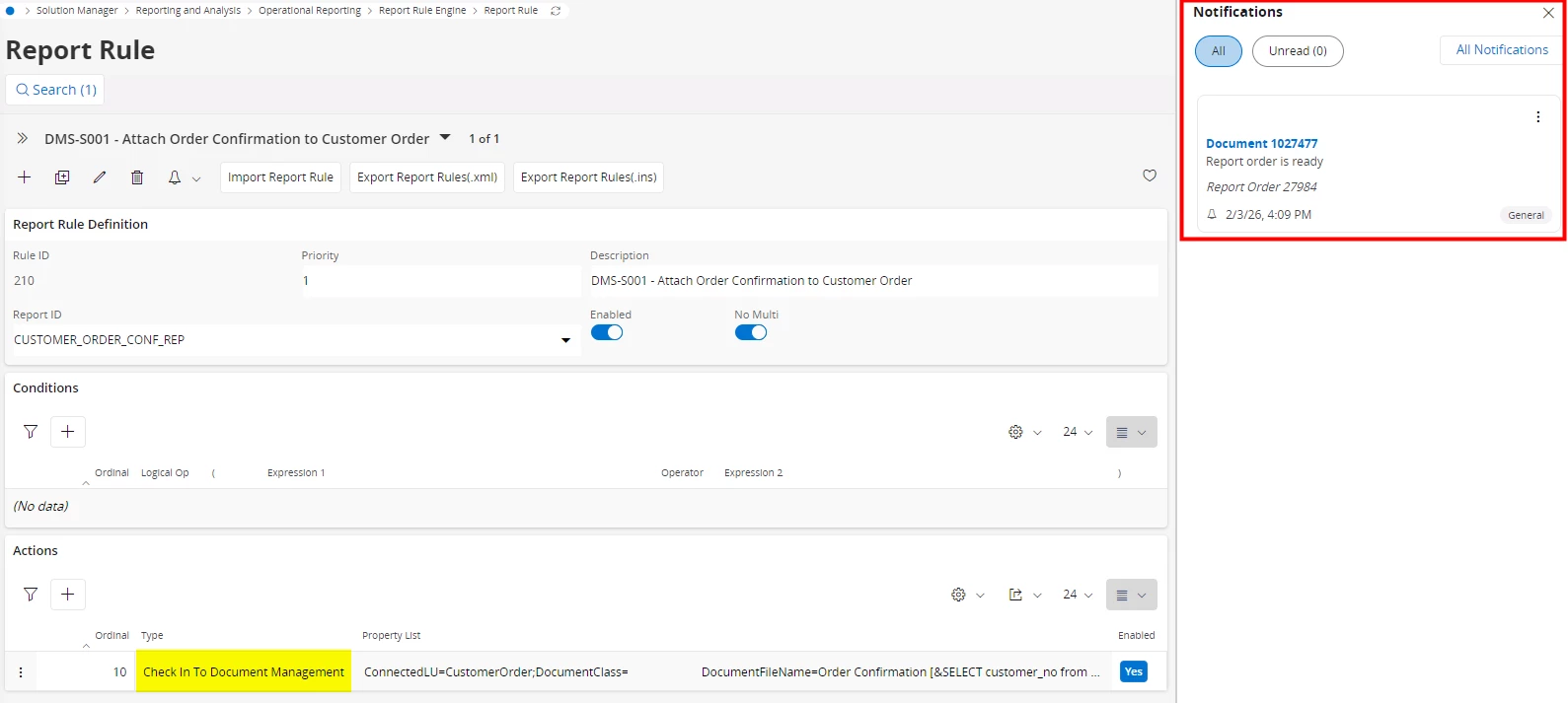 When I create a document using the report rule and attach it to the object, I receive a notification. Can this be disabled somewhere?