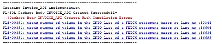 We're trying to add a new column to the 'Invoice' entity using the Developer Studio. During deployment, we encountered an error: "IFSAPP.INVOICE_API" has errorsORA-06508: PL/SQL: could not find program unit being called: "IFSAPP.INVOICE_API"ORA-06512:. This error indicates that the new column wasn't automatically included in the 'invoice_rec_' record type within the 'INVOICE_API' package.