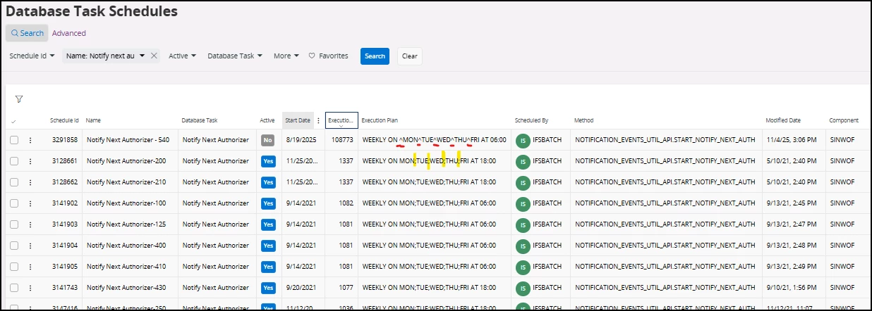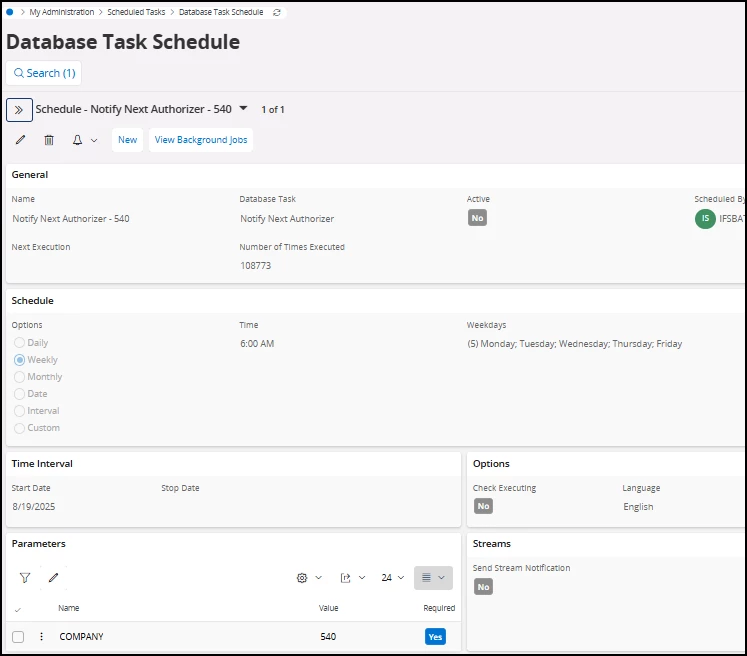 We have multiple companies in our IFS environment. For each of these companies, we have set up database Task Schedules to run the Notify Next Authorizer task for Supplier Invoices.