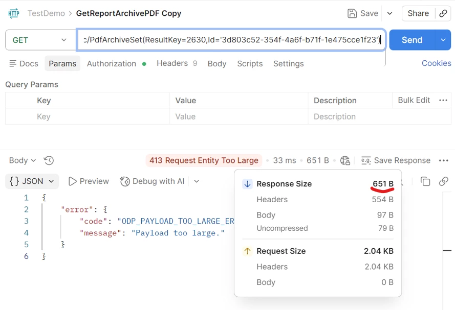 Request: https://xxxxxxx.com/b2b/ifsapplications/projection/v1/ReportArchive.svc/PdfArchiveSet$top=1 Error: <ERROR>{"error":{"code":"ODP_PAYLOAD_TOO_LARGE_ERROR","message":"Payload too large."}}</ERROR>