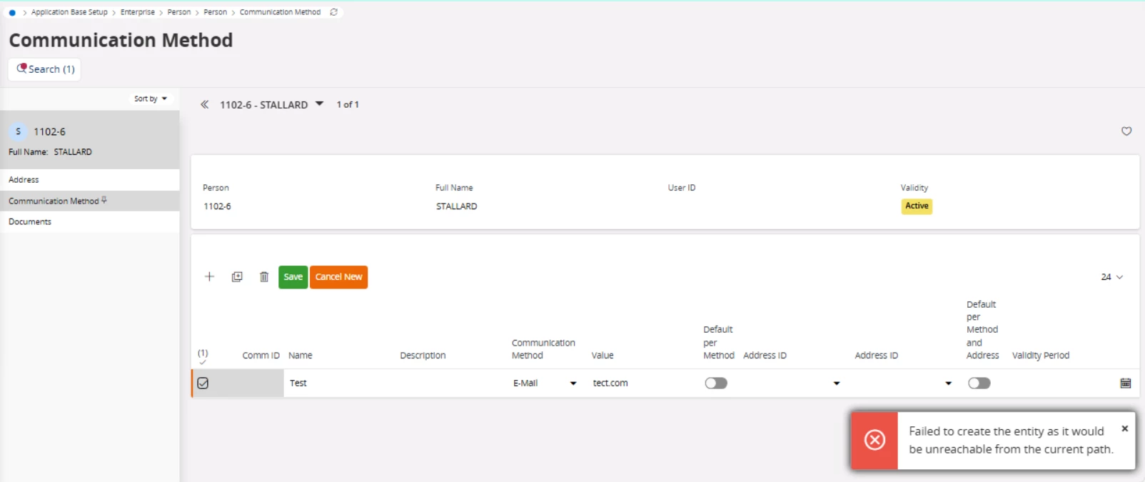 We have migrated the legacy customer contact data to IFS but when I try to add a communication method for a contact person I am getting this error message.