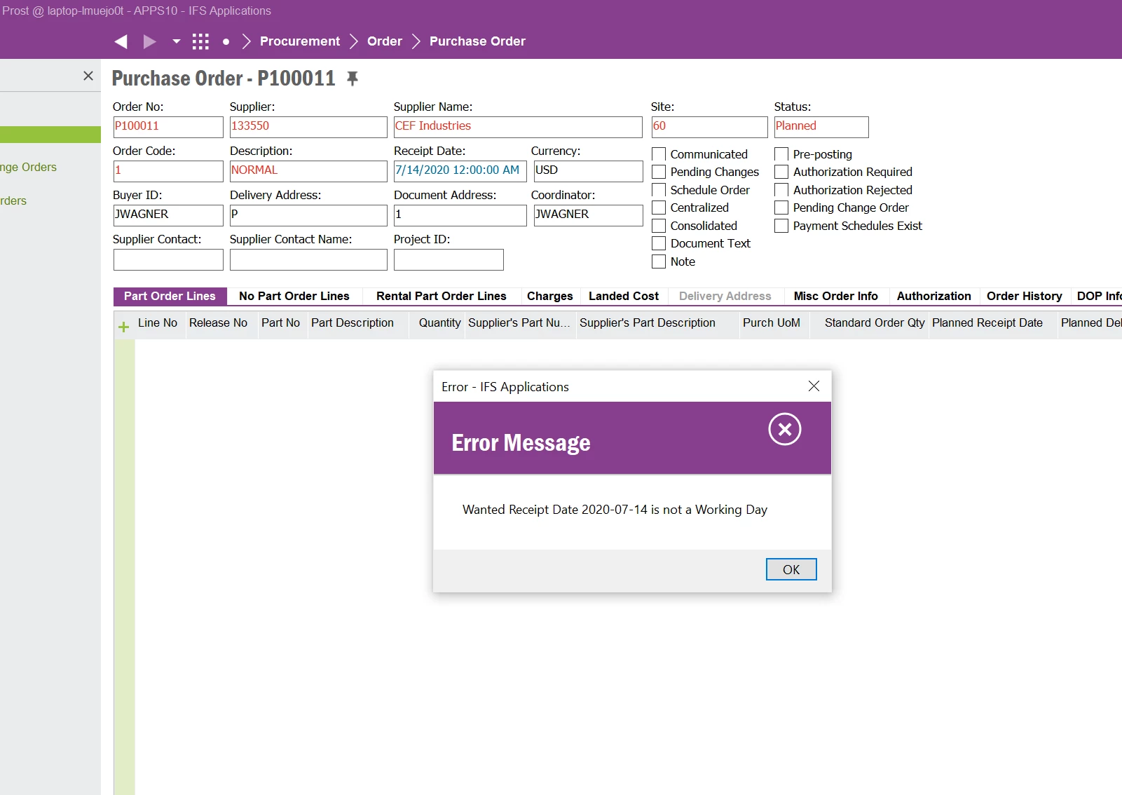 I am working in the alain app 10 demo environment. When attempting to create a Purchase Order header I get error message “Wanted receipt date (any week day I enter) is not a working day. Any idea on how to fix this? Screen shot attached.