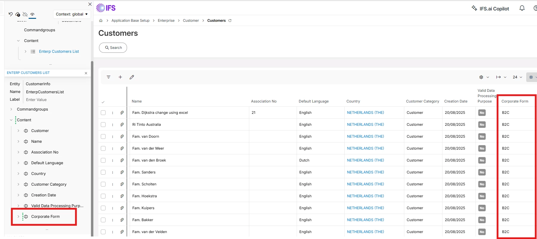 Customers overview aware of Corporate Form field