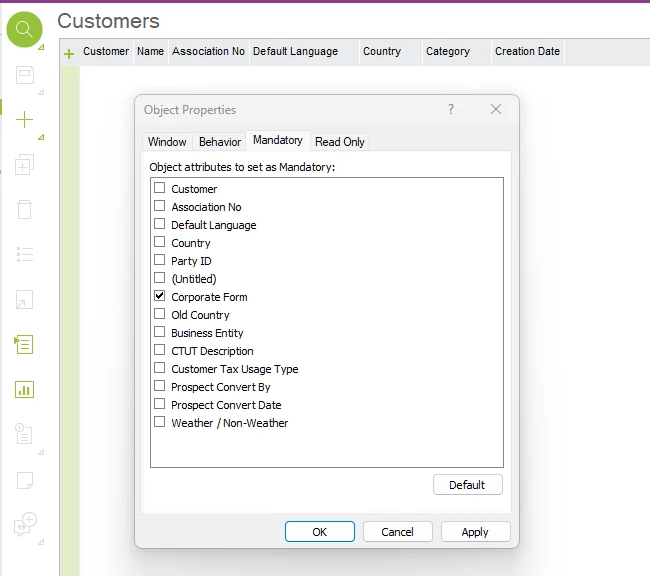 I have a hopefully interesting issue that I’d like a larger audience in reviewing. I received a request to expose the field CORPORATE_FORM, associated with the CustomerInfo LU on the Customers overview screen (Presentation Object ID tbwCustomerInfoOverview). I can see that there’s the option to make a mandatory field in the Properties > Mandatory tab, but no option to expose it via the column chooser.