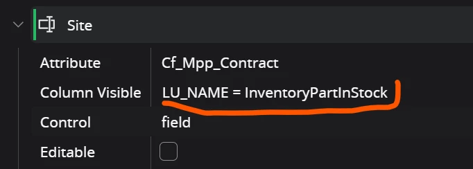For example, I have a custom field named part_no on the Approval page, and I would like it to be visible only when LU_NAME = 'InventoryPartInStock'.