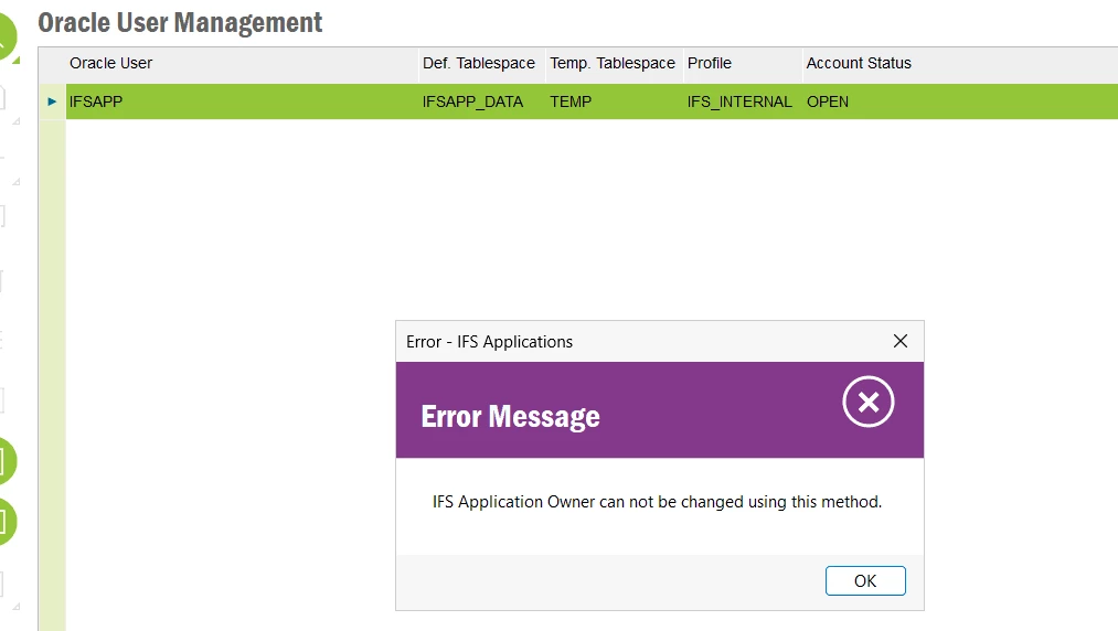 Attempting to change the AppOwner password via the IFS client (Oracle User Management or RMB → Change Password) results in an error stating that the operation is not allowed. This behavior is expected and by design.