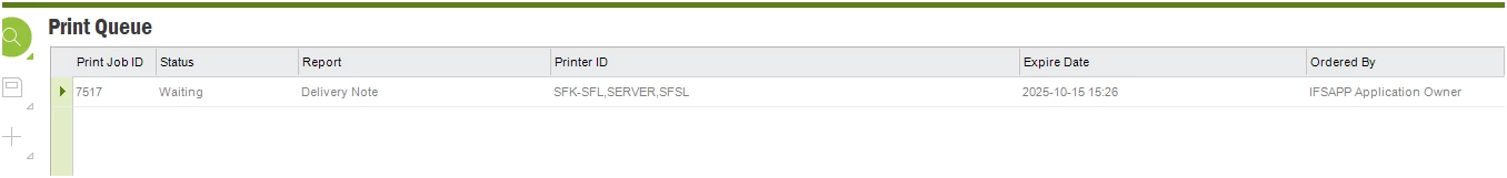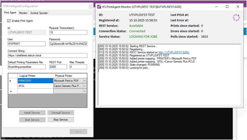 Thanks for quick reply. The Print Agent is up and running, looking for jobs. It’s configured with the logical printer called SFSL, and supposed only to print delivery notes and pick lists. Printer driver is installed on the server and printing a test page works. Login with IFSPRINT works from sqlplus.