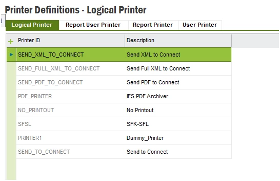 Also, your “Setup IFS Connect” screenshot doesn’t show a physical printer mapped there either. I’m not 100% sure if it needs to be, but ours does, and I would think that if a Logical printer was included there then it would need a physical to be included too… in our case we have mappings to explicit ports and IP addresses for network-printable printers. Example:
