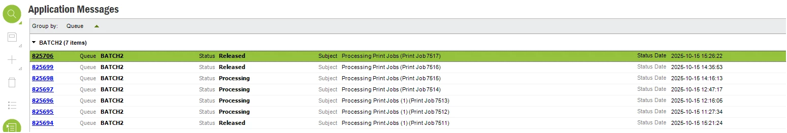 I have purged print_job_tab a couple of times, and right now there’s only job 7517 with status “Waiting” there. The application message for job 7517 has status “Released”. Older messages are still there and some of them has status “Release” and others “Processing”.