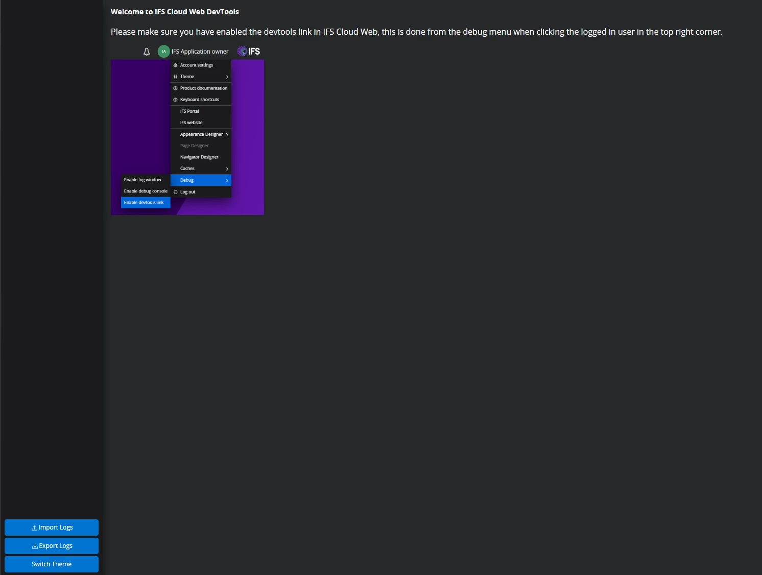 The problem manifests itself like this. I open IFS Cloud, active the devtools link. Then I press F12 and I can see the standard network traffic from IFS Cloud and I can also Inspect web page elements.