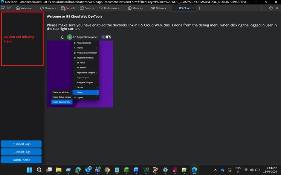 The problem manifests itself like this. I open IFS Cloud, active the devtools link. Then I press F12 and I can see the standard network traffic from IFS Cloud and I can also Inspect web page elements.