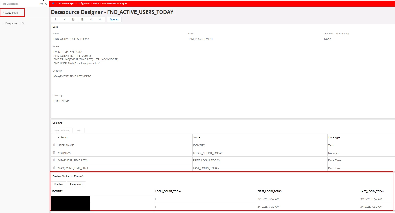 I suspect the issue may be related to the view/query I am using. I created a new Lobby Datasource, saved it successfully, and was able to preview output. However, when I try to add it to an element/dashboard, the datasource does not exist.