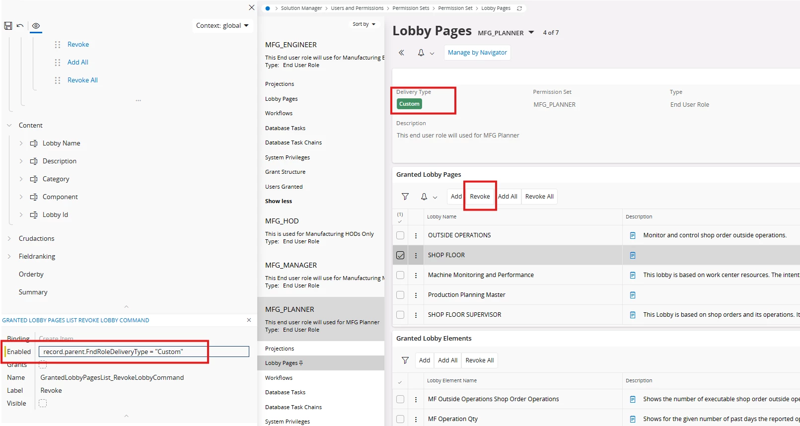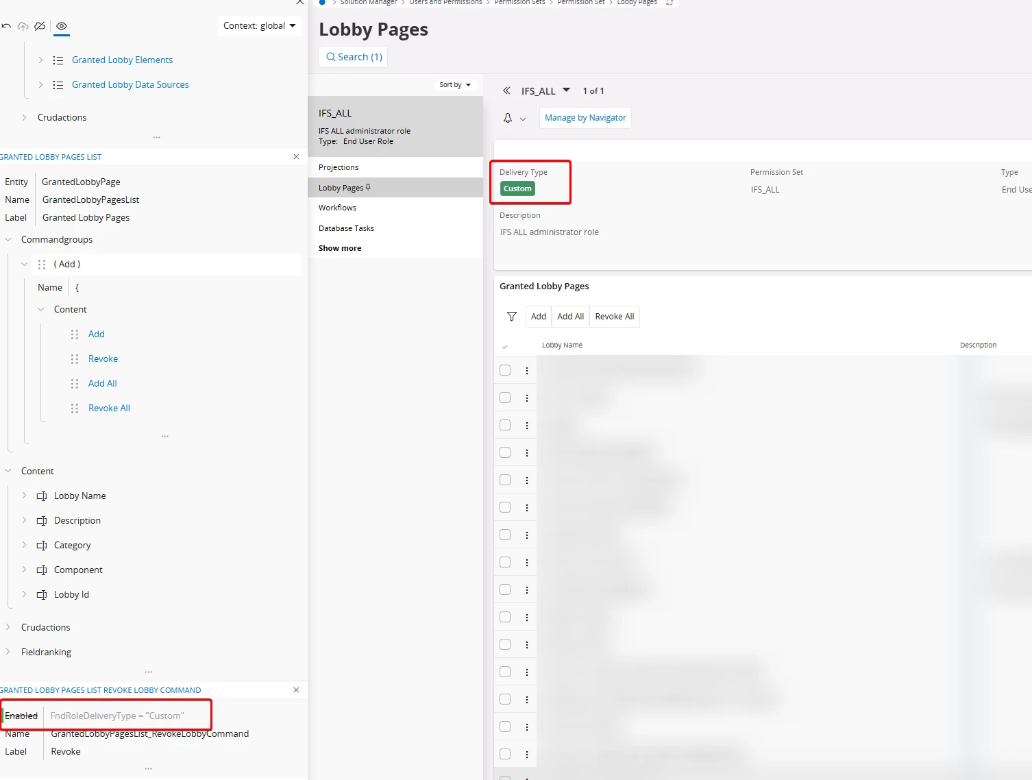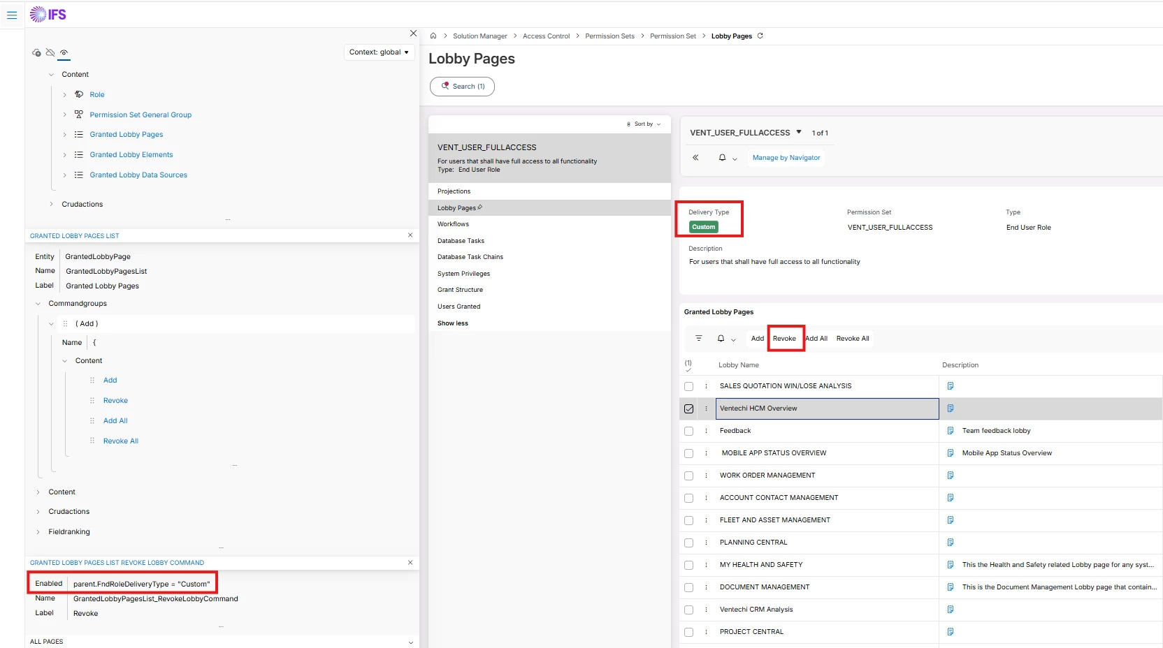 I checked in 25R2, the condition to enable the Revoke command is parent.FndRoleDeliveryType = "Custom", means that, Revoke command would be available for all permission sets, which are not managed/provided by IFS, and it is working fine there.