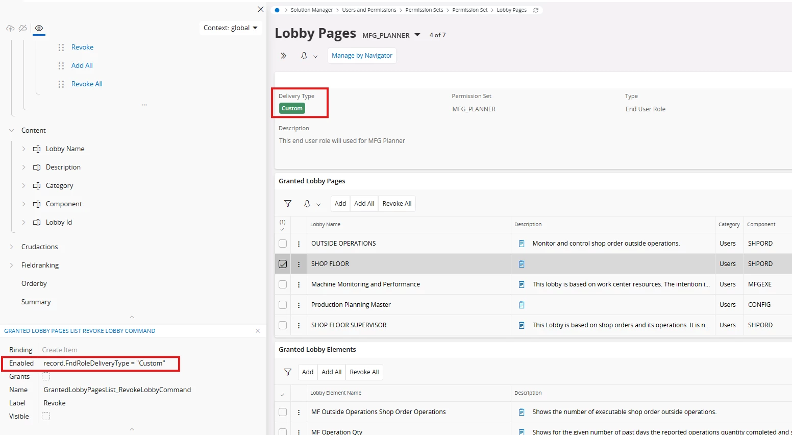 However, for 24R1, the condition is record.FndRoleDeliveryType = "Custom", which is not possible to fulfill since there is no attribute like Delivery Type is available at the Granted Lobby Pages section.