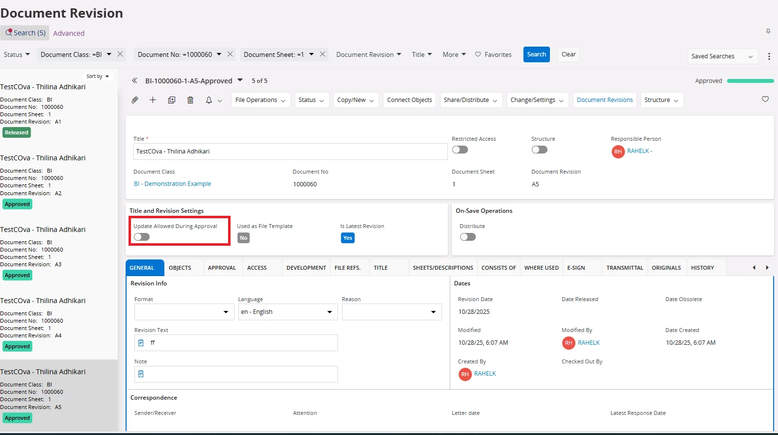We have encountered an issue with the Document Revision window. When a new revision is created and the title is changed in that revision, the change is automatically applied to all previous revisions as well. This occurs regardless of the document status and whether the Update Allowed During Approval toggle is enabled or disabled.
